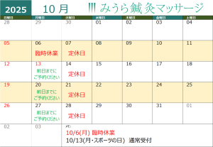 10月13日(月・スポーツの日)は祝日ですが通常受付(前日までにご予約ください)となっております。