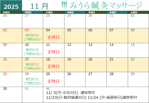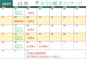 11月・12月のお休みは以下のカレンダーの通りです。